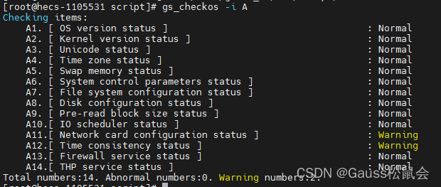 5.以root用户执行如下命令对服务器的OS参数进行检查。检查服务器的OS参数的目的是为了保证数据库正常通过预安装,并且在安装成功后可以安全高效的运行。详细的检查项目请参见《工具参考》中的“服务端工具 > gs_checkos”工具。
