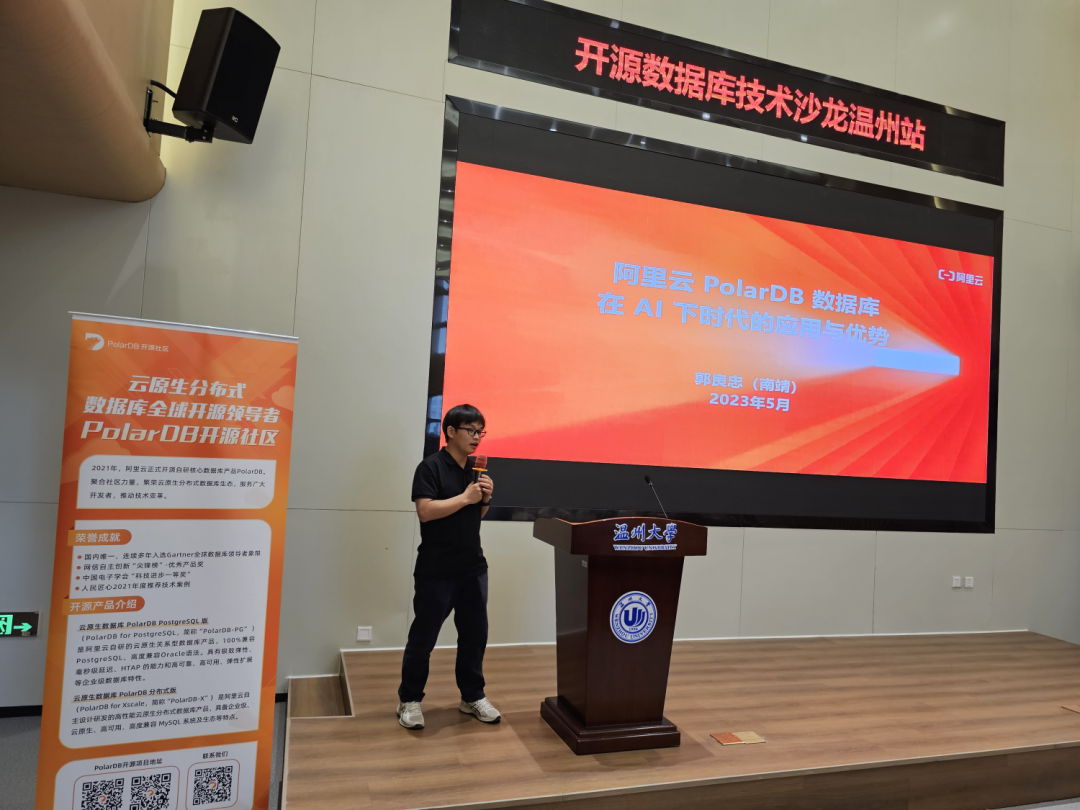 5月12日,由PostgreSQL中文社区和PolarDB开源社区联合举办的开源数据库技术沙龙(温州站)圆满落幕!本次活动邀请到来自阿里云、PG中文社区、温州大学等多位资深技术专家与老师,共同探讨研讨数据库在云计算、AI等领域的发展趋势和机遇,推动数据库人才发展。