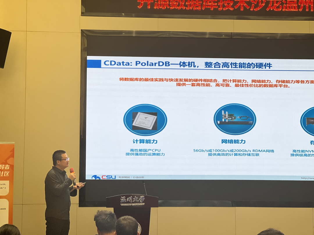 中启乘数科技创始人唐成介绍了高性能的PolarDB数据库一体机解决方案。CData是一款高性能数据库云产品平台,支持高可用、高性能、水平拓展等特性。CData搭载PolarDB将发挥出极致的性能优势。