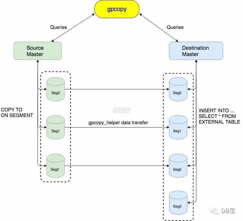 以下是 gpcopy 应用于相同节点数 Greenplum 集群间传输的架构,还是很简单直接的。