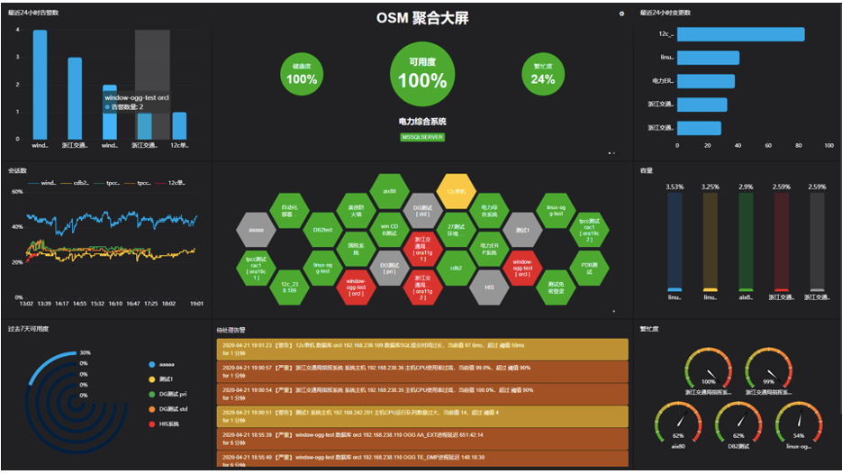 (数据库运行安全聚合大屏)◆ 结合告警模版定义和错误日志自动识别,实现对数据库运行状态变化的监控。