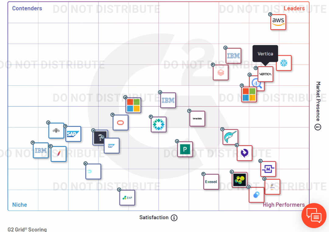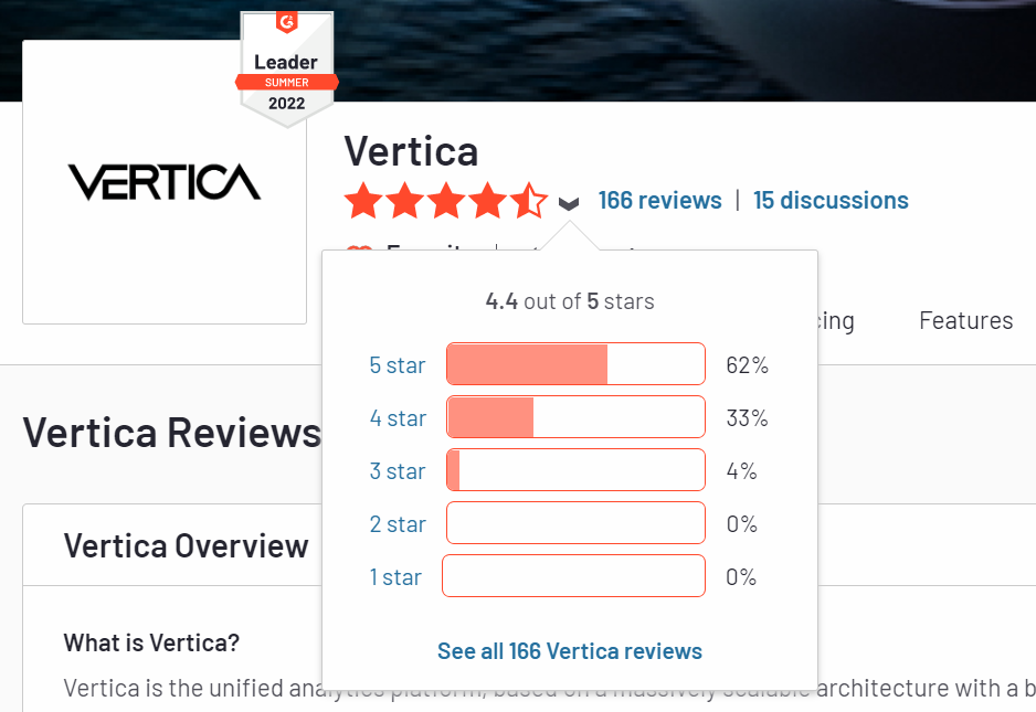 拥有“全球商用软件领域的‘大众点评’”美誉的 G2,在当下代表了全球较大且最值得信赖的软件用户市场,其评估指标均基于经过真实性验证的用户热度和市场存在感数据。G2 的“领导者”荣誉主要给予在单项类别中排名前 25% 的产品,而 Vertica 在上述所有类别中从超过 95% 的用户群体中收获 4-5 颗星的高分评价,平均 4.4 颗星(满分 5 颗星)。此外,超过 87% 的受访客户表示他们会推荐 Vertica。