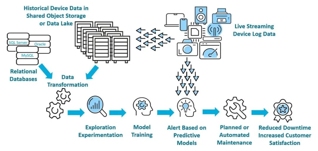 当机器学习用于预测性维护时,历史维护日志以及多年来所收集的传感器信息等,将累积在数据存储系统中,如 HDFS 等文件系统或 S3 等对象存储位置。机器学习模型可基于该数据训练,以识别所指示的潜在问题模式;然后,最新数据从设备及其组件流入,并由经过训练的模型审查,任何潜在问题被发现时会触发警报,以便您的团队在故障真正发生之前就计划好并采取补救措施。