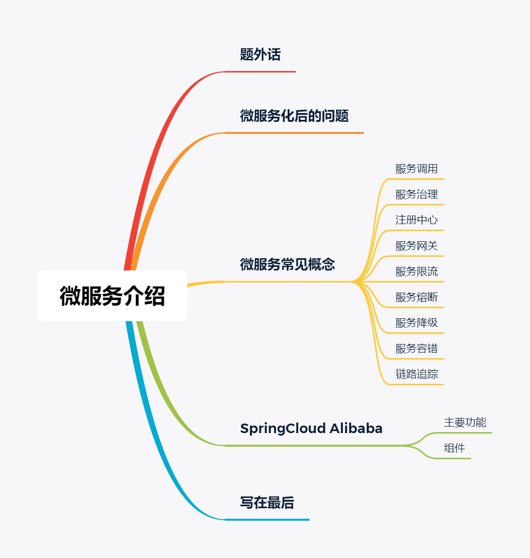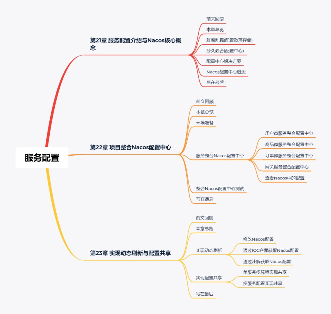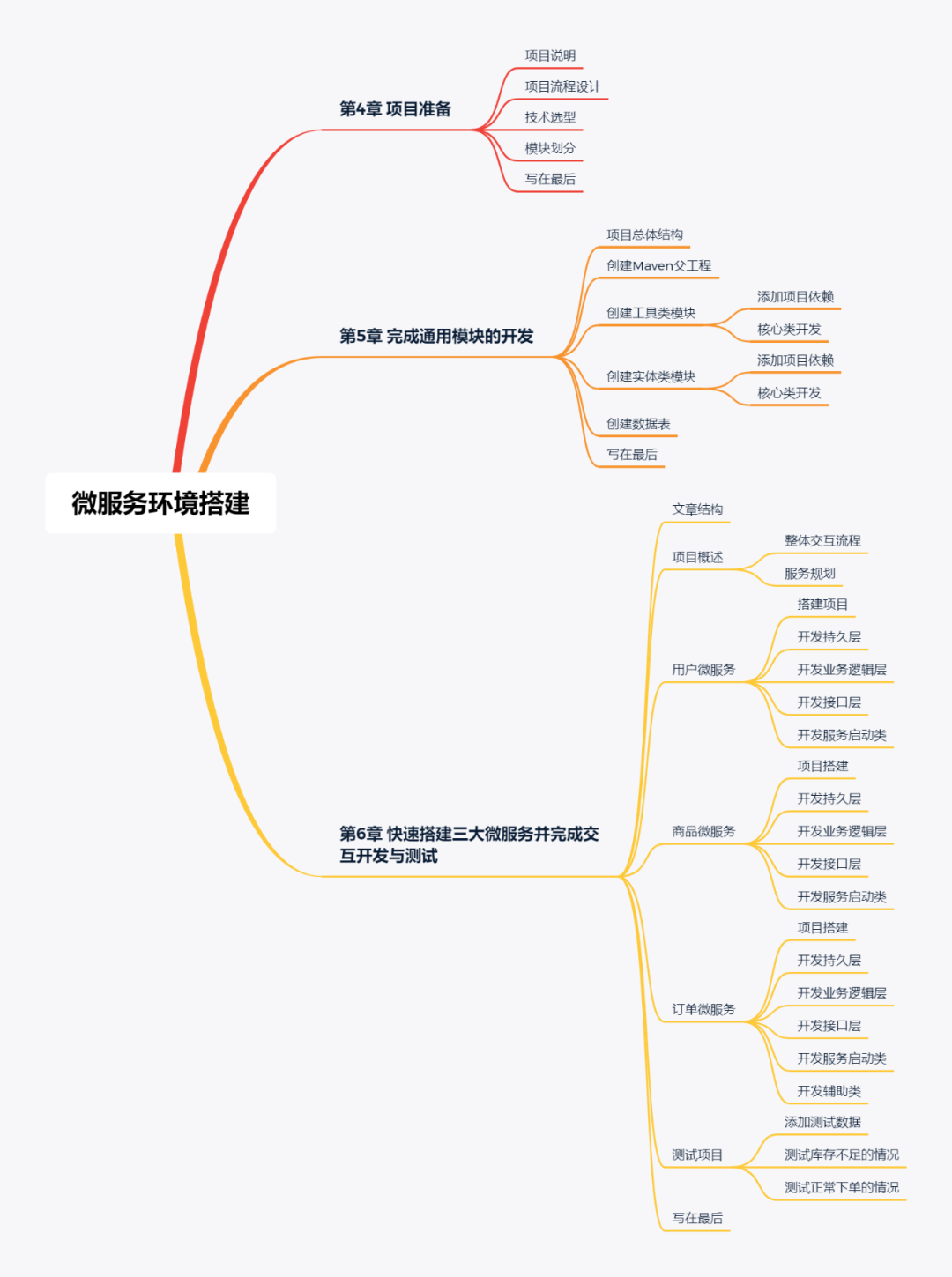专栏总体上分为十个大的篇章,分别为:专栏设计,微服务介绍,微服务环境搭建,服务治理,服务容错,服务网关,链路追踪,消息服务,服务配置,分布式事务。如下所示。