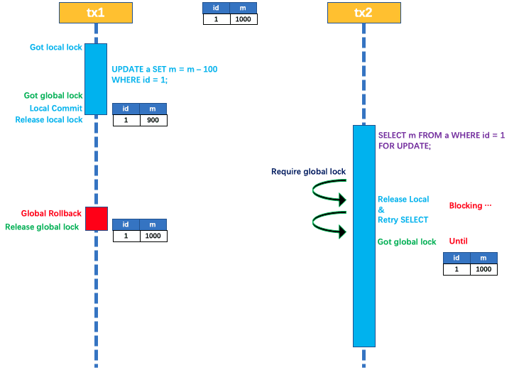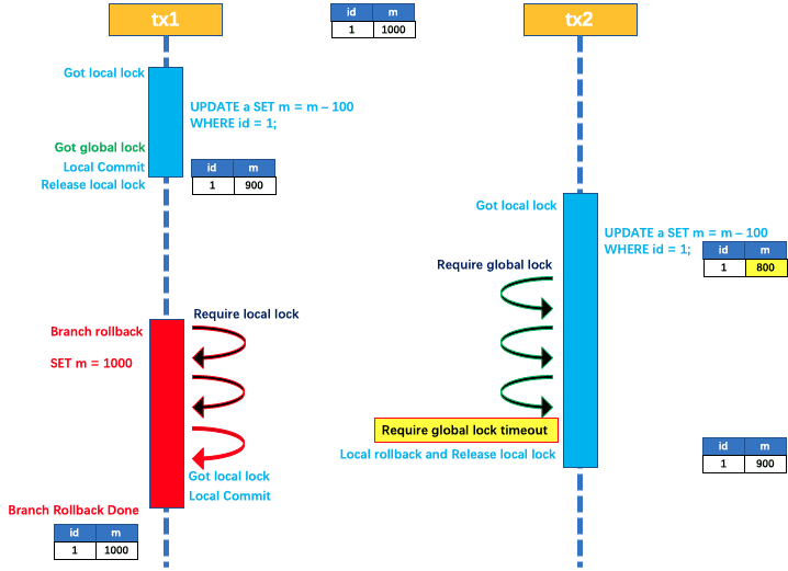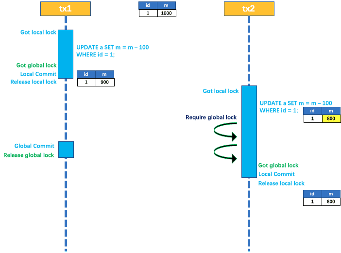 tx1 先开始,开启本地事务,拿到本地锁,更新操作 m = 1000 - 100 = 900。本地事务提交前,先拿到该记录的 「全局锁」 ,本地提交释放本地锁。tx2 后开始,开启本地事务,拿到本地锁,更新操作 m = 900 - 100 = 800。本地事务提交前,尝试拿该记录的 「全局锁」 ,tx1 全局提交前,该记录的全局锁被 tx1 持有,tx2 需要重试等待 「全局锁」 。