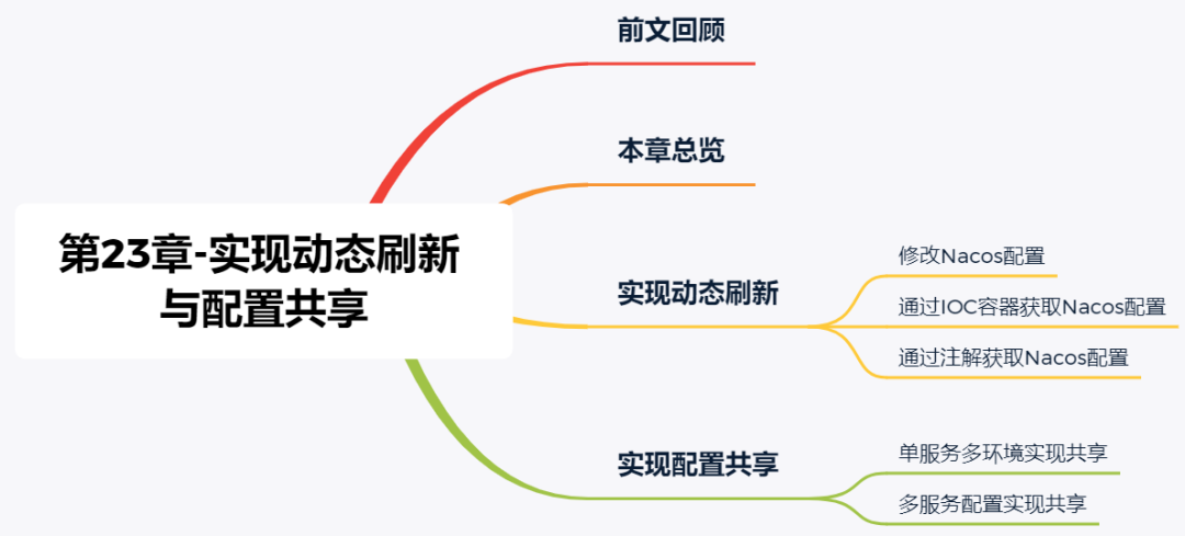 在服务配置章节,我们首先介绍了服务配置与Nacos作为配置中心的相关概念,并在项目中整合了Nacos配置中心。接下来,就基于Nacos实现动态刷新与配置共享。