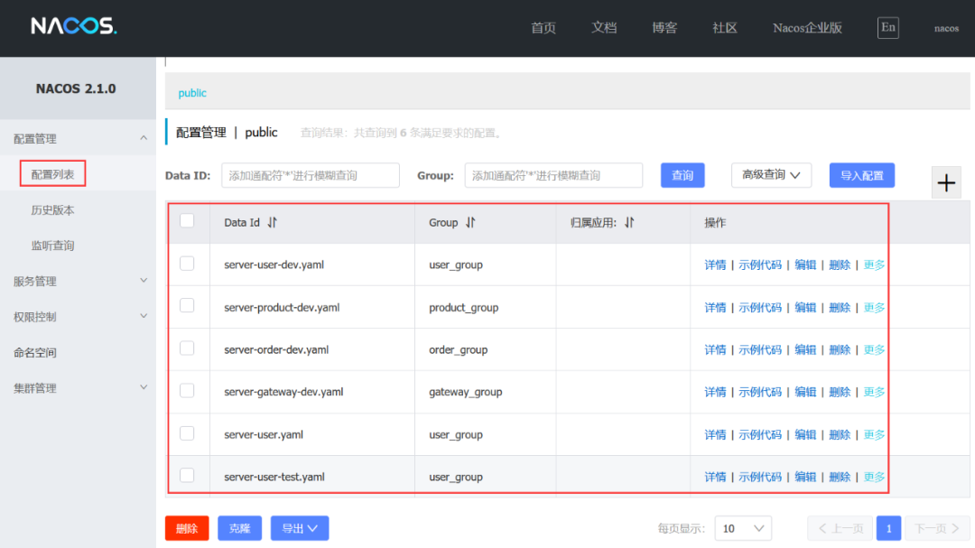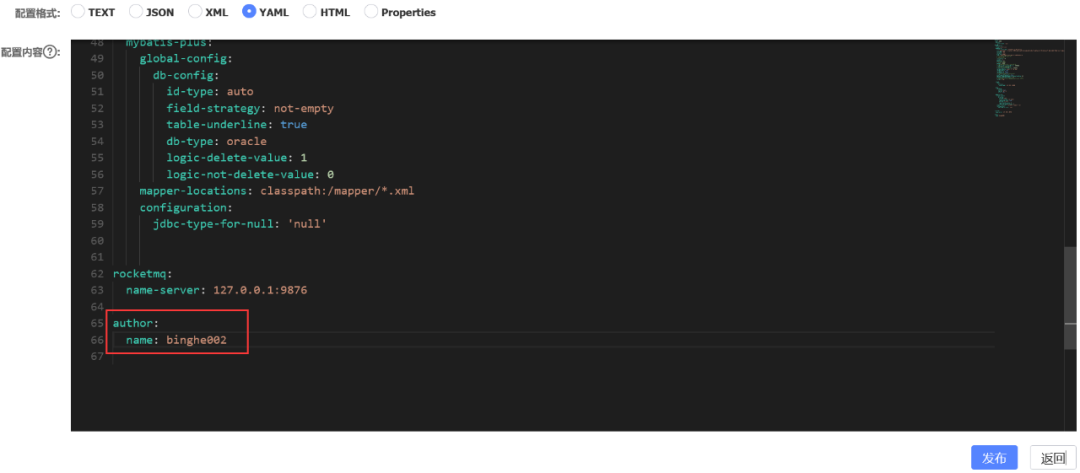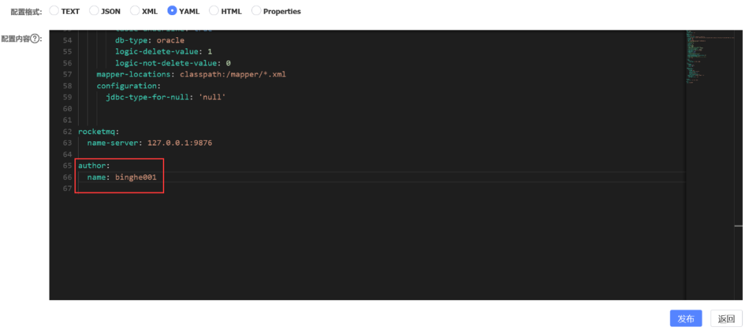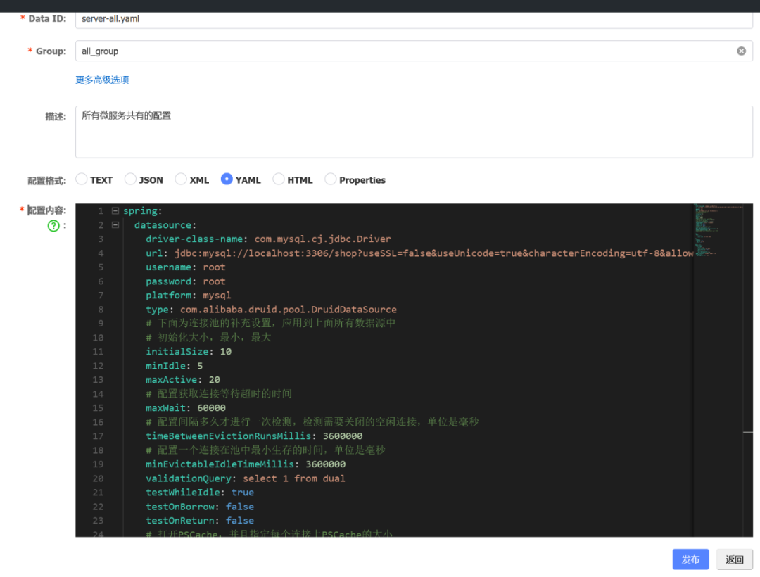 点击发布,接下来就是在Nacos中修改各个微服务的配置,将各个微服务的配置中公共的配置删除。