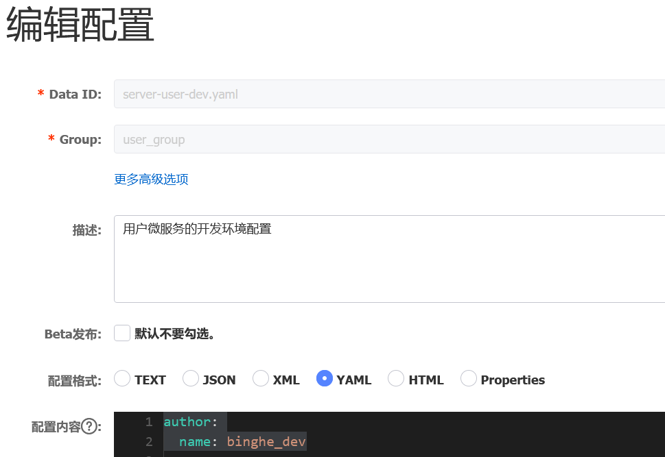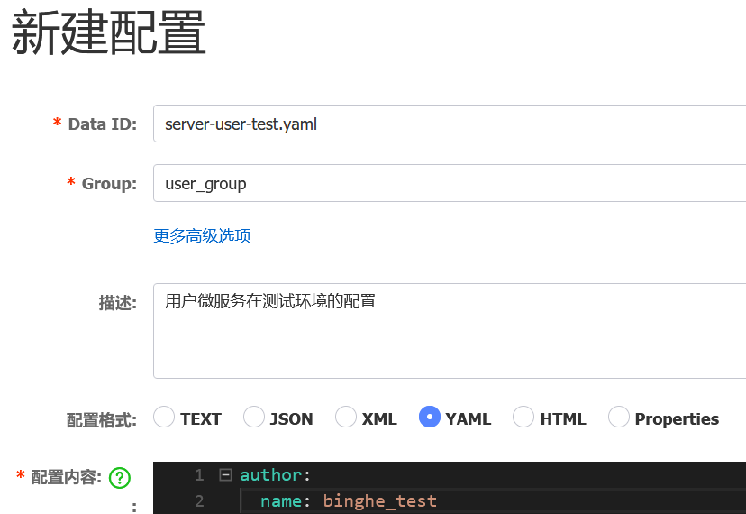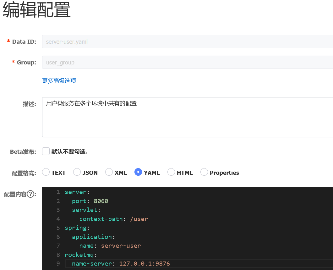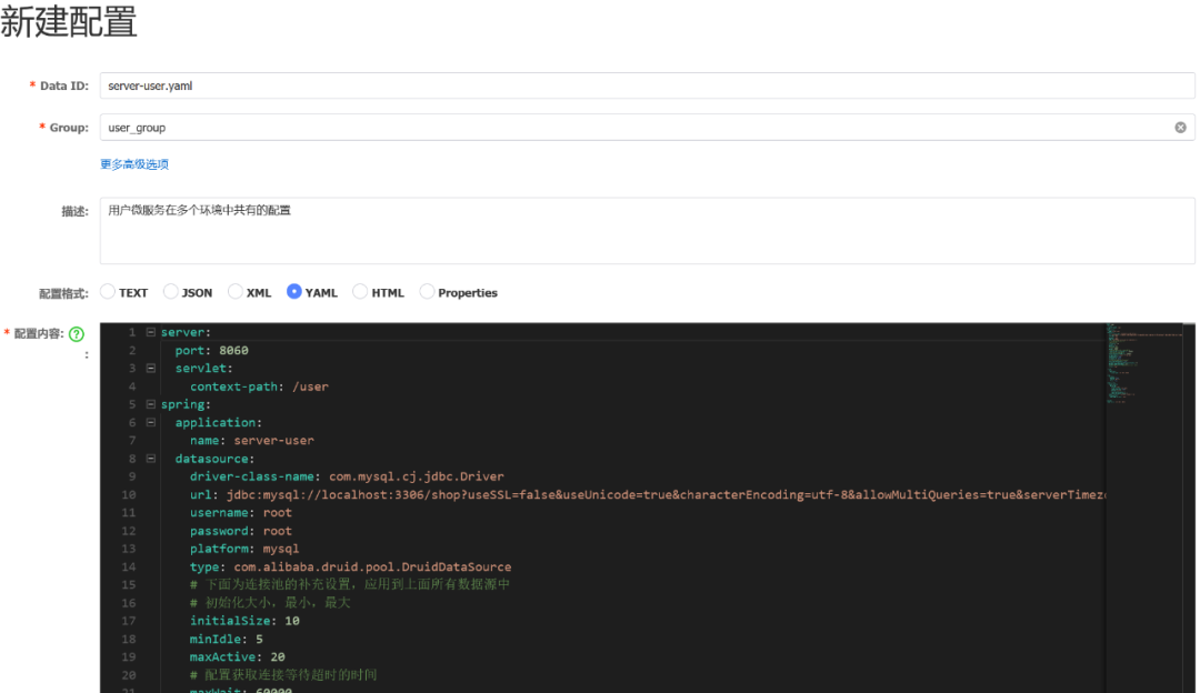 (1)在Nacos中新建一个以server-user.yaml为Data ID的配置,并且将用户微服务在各个环境中共有的配置复制进去,如下所示。