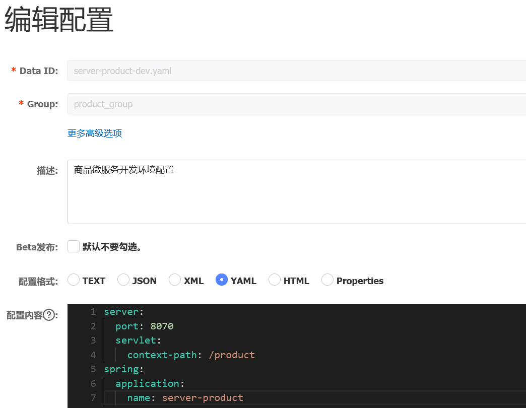 (3)在Nacos中修改server-product-dev.yaml的配置,修改后的配置如下所示。