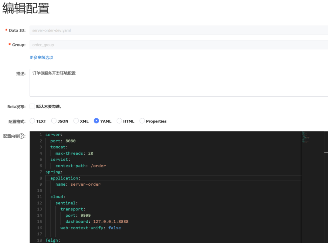 (4)在Nacos中修改server-order-dev.yaml的配置,修改后的配置如下所示。