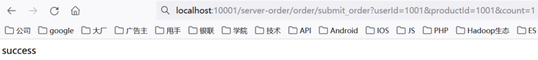(8)分别启动用户微服务,商品微服务,订单微服务和服务网关,在浏览器中输入localhost:10001/server-order/order/submit_order?userId=1001&productId=1001&count=1