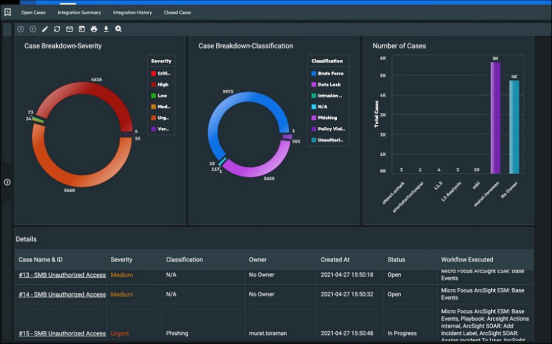 另外,我们还新增了新的控制面板和报告,涵盖未结案件、已结案件、整合历史和整合摘要,SOAR 报告现在具有与 ArcSight 其他产品相一致的外观体验。