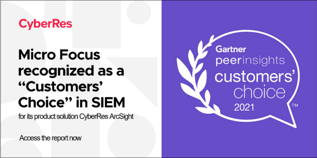除此以外,我们还被 KuppingerCole Leadership Compass 评为“智能 SIEM 平台的领导者”。在 《Gartner Peer Insights 'Voice of the Customer' for SIEM》报告中,Micro Focus 被评为 2021 年 "客户选择"。