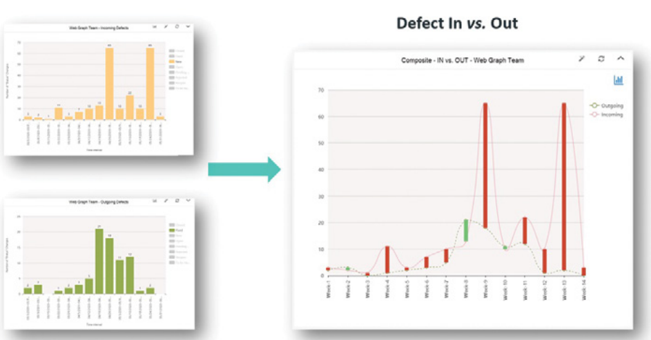 新引入的图表类型提供了对数据的高级洞察力。复合图将实体与多个图形相关联,趋势图显示进展和趋势,周期图帮助分析端到端的时间,如 "解决问题的时间",以确定应用交付过程中的瓶颈或浪费。异常图则帮助识别被卡住很长时间的工作,以避免延误。