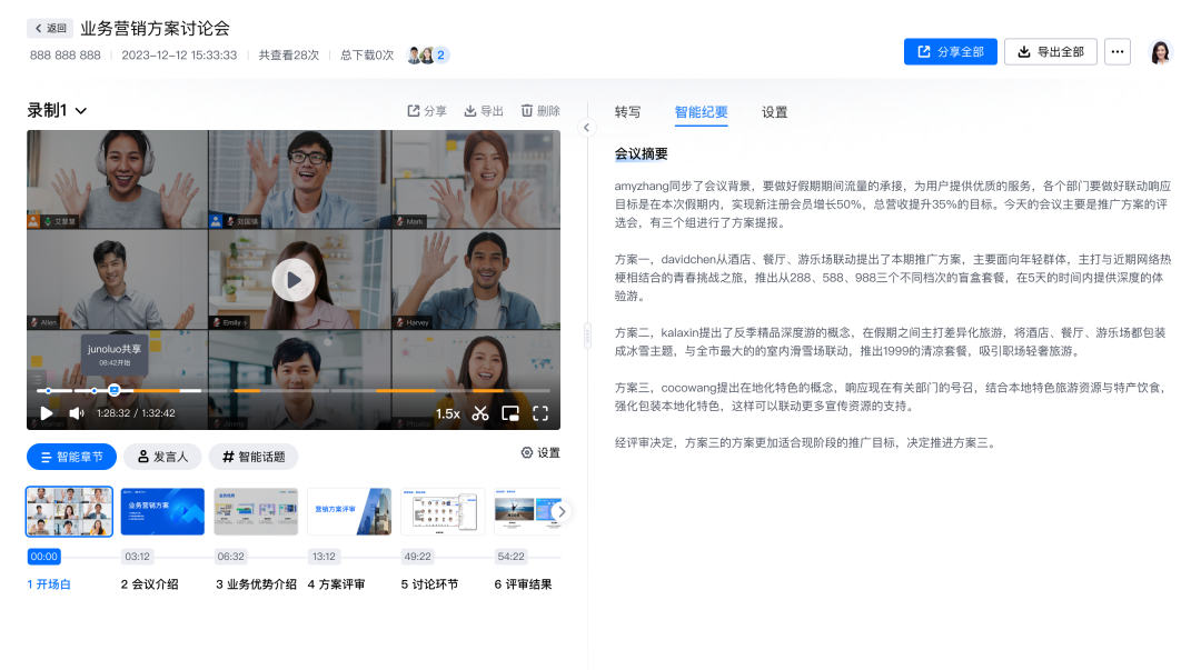 现在,腾讯会议的“智能章节”功能,可以将会议录制视频自动划分为数个易于浏览的章节。像看目录一样,你能分章节快速找到目标内容。