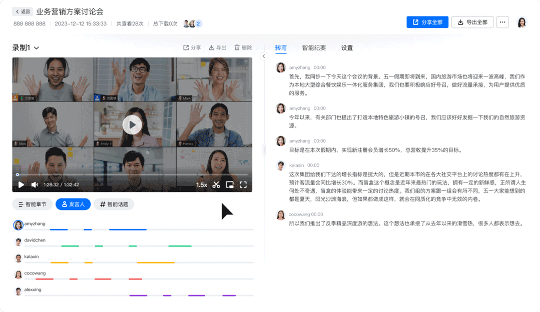 如今,“智能话题”归纳功能,可以基于会议内容自动总结相关热点话题,清晰看到会议中重点聊的方向以及相关内容,更个性化地回顾会议。