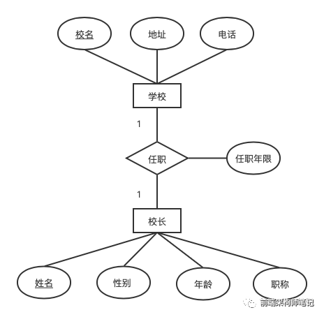 这种方式为了体现学校和校长之间的联系,会将校长实体的主键“姓名”并入学校实体中,再加上联系本身的属性“任职年限”就可以了。