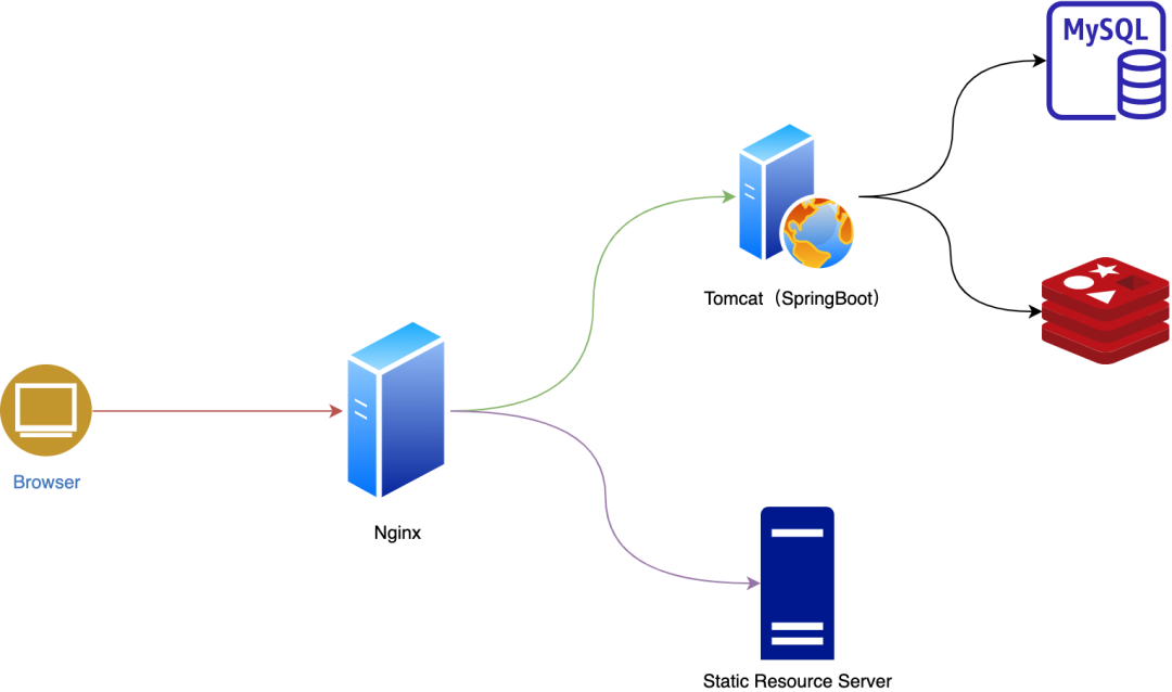 浏览器发出请求。 请求首先到达 Nginx 服务器,Nginx 服务器,由 Nginx 服务器进行请求分发。 如果是一个静态资源请求,则 Nginx 将之转发到静态资源服务器上,一般可能由 Nginx 自己兼任静态资源服务器,也就是直接从 Nginx 自己硬盘上将数据读取出来。 如果是一个动态资源,则 Nginx 将之转发到 Tomcat 上,对于我们这里就是我们的 Spring Boot 服务上了,当然,如果你没有这么多服务器,我们可以将 Nginx 和 Spring Boot 部署到同一台服务器上。