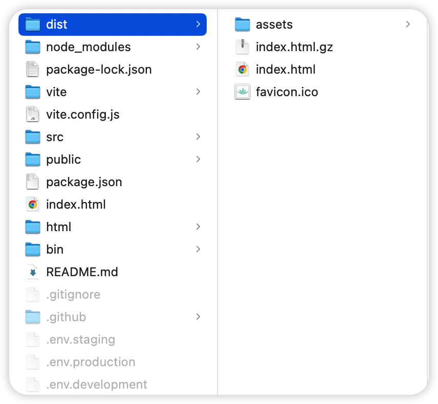 打包完成后,会生成 dist 目录,里边的文件就是我们所需要的静态资源文件:
