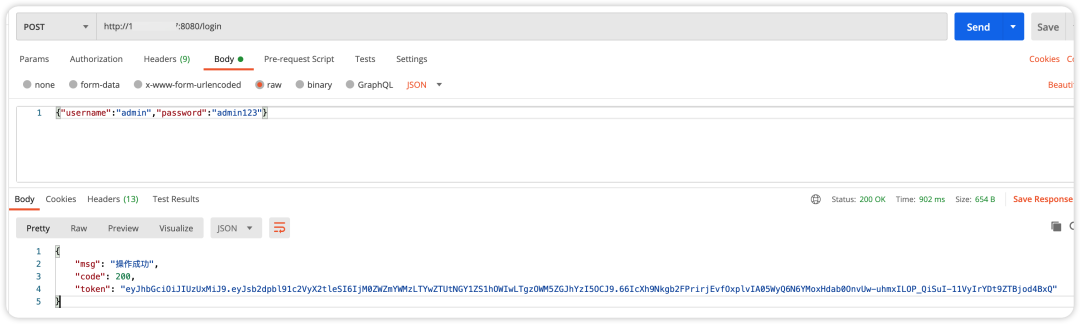 服务端启动成功之后,我们先用 postman 测试一下登录接口,确保能运行,就说明服务端部署成功: