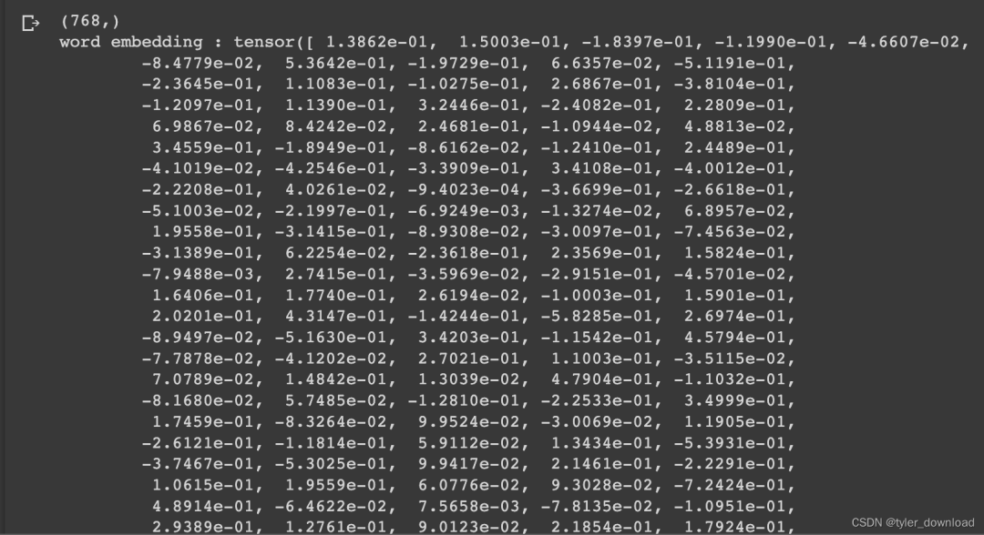 上面代码通过下载已经训练好的BERT模型,然后将给定句子进行分词,每个单词在模型训练的语料中都有对应编号,我们找到其编号也就是上面对应的word1_tokens等输入到模型中获得其对应向量word1_embedding,我们不用关心上面代码的逻辑,只需要知道代码把单词转换为向量即可,然后我们把向量打印出来看看: