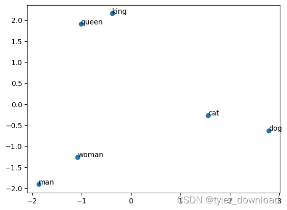 在句子中有几个关键词,(man,woman), (king, queen), (dog, cat),可以看到每一组的两个词,它们在含义上互相接近,因此有理由预计如果将他们转换为向量,那么括号对里单词对应的向量在空间上的距离会相互接近,我们用代码检验一下: