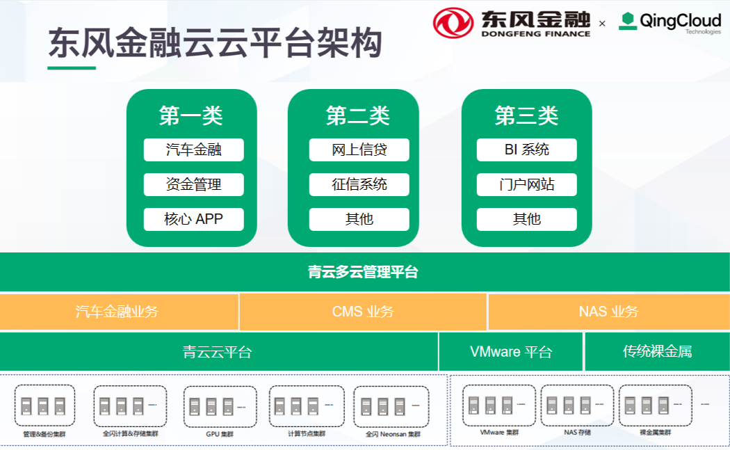 青云QingCloud 团队对东风金融的需求进行了深入分析,制定了充分利旧、足够开放、高可用、易维护管理的设计原则,着力为东风金融搭建一个先进、稳定的硬件基础平台架构,利用云计算解决基础架构效能未充分发挥的问题、敏捷交付的问题、庞杂的管理问题,建立资源供给和维护标准,建立运行规范、运维规范,建设自动化运维能力,解决 IT 基础设施的统一治理问题,帮助东风金融实现以业务价值为导向的新型 IT 云化建设转型。