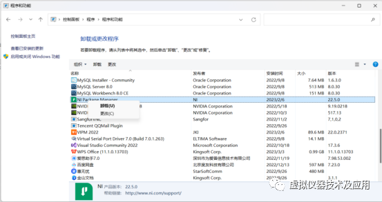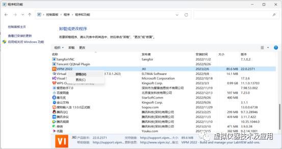 ①在(8)的③中打开的“卸载程序”窗体中找到“VIPM 2022”并右键点击,在弹出的菜单中选择“卸载”;