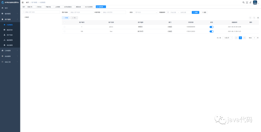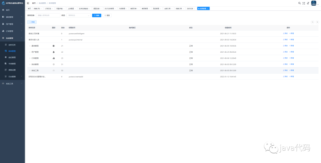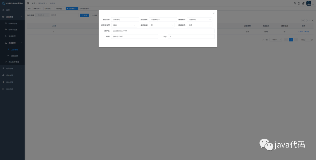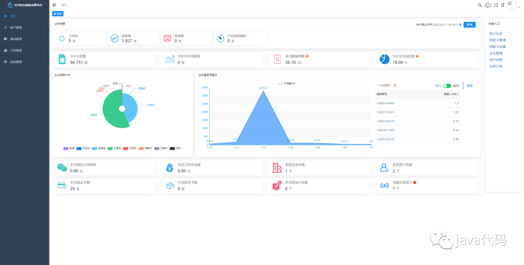 IoTLink基于 SpringBoot、Vue、Mybatis、RabbitMq、Mysql、Redis 等开发,支持物联网卡、物联网模组、卡+模组融合管理。提供状态、资费、客户、进销存、合同、订单、续费、充值、诊断、账单等功能。平台可同时接入中国移动、中国电信、中国联通、第三方物联网卡进行统一管理。逐步完善平台,助您快速接入物联网,让万物互联更简单。