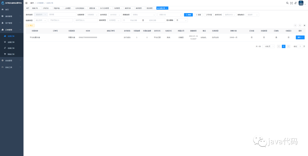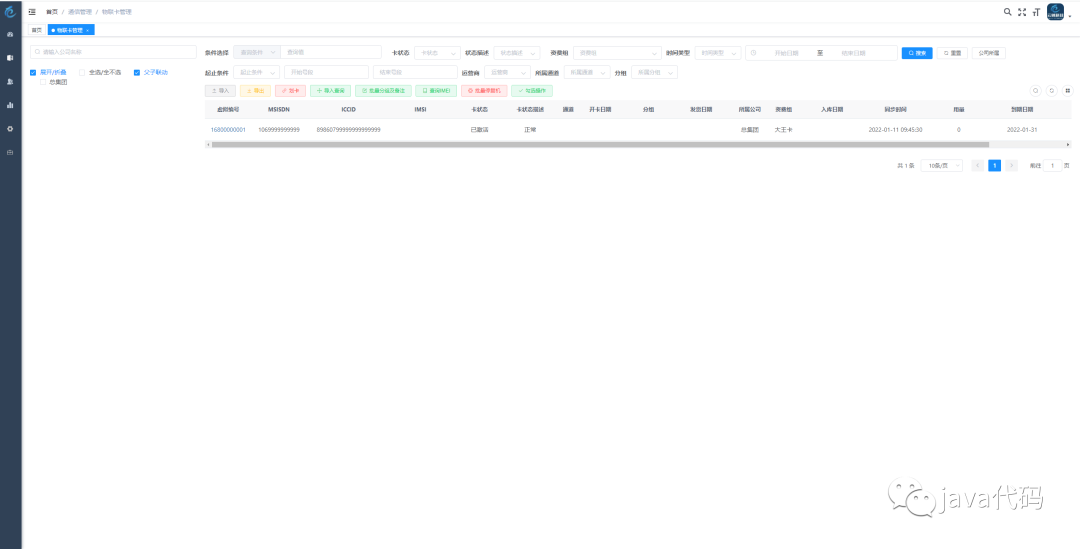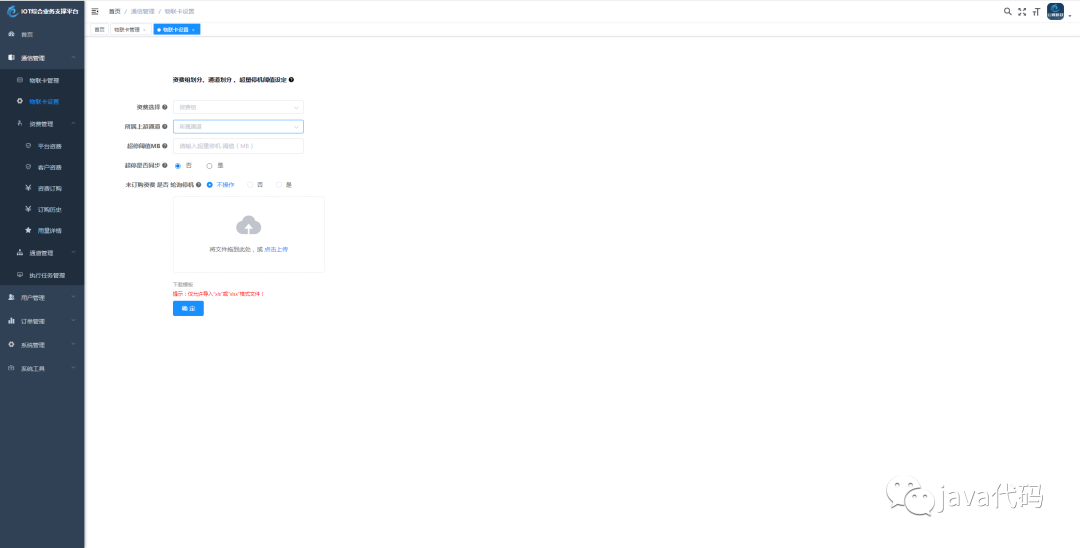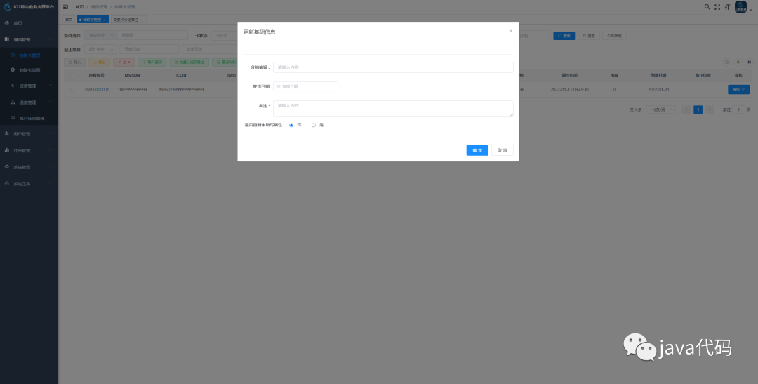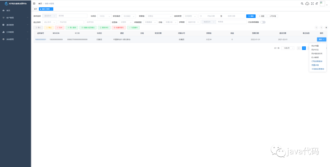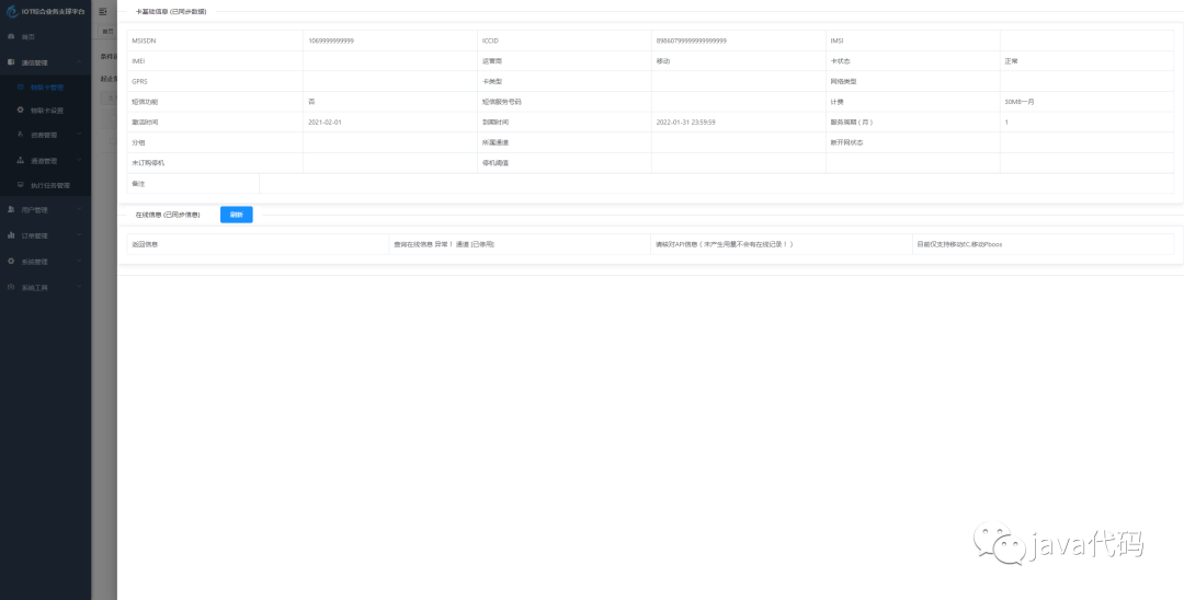 通信管理:主要用于所有物联卡的综合信息查询,同时提供不涉及资费产品订购的终端和物联卡的功能配置管理。