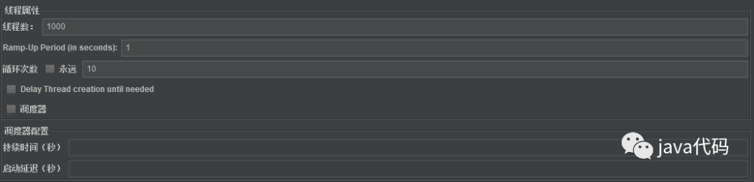 测试工具使用Jmeter并发测试工具,为保证无非相关变量的影响,每次测试的并发线程数均设为1000,并发时间1s,并发循环次数为10次,如图所示: