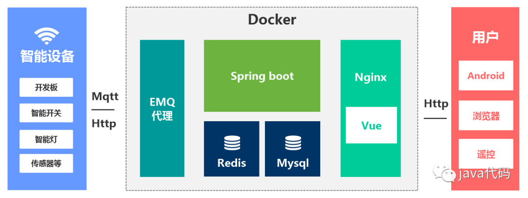 服务端使用spring boot、数据库mysql和redis、前端vue、移动端android、硬件端ESP-IDF和Arduino等。软硬件交互基于Mqtt协议,使用EMQ代理服务器。系统架构图如下: