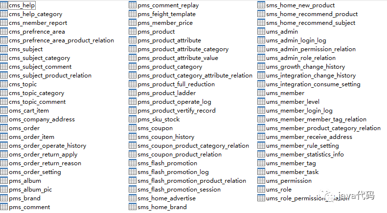 ├── mall-mbg -- MyBatisGenerator生成的数据库操作代码