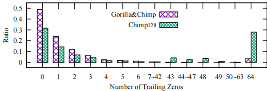 一种有效的方法是在传输和存储之前对时间序列数据进行压缩。通用压缩算法如LZ4和Xz,虽然可以达到很好的压缩率,但没有利用时间序列数据的内在特征,而且他们只能按照批处理模式运行,非常耗时,且不太适合流式时间序列数据。针对流式浮点时间序列数据的压缩方法有两类,即有损压缩算法和无损压缩算法。但有损压缩算法会丢失一些信息,不适合科学计算、数据管理、网络传输等关键场景。针对流式浮点数据的无损压缩通常基于异或运算,典型的算法如Gorilla和Chimp。Gorilla假设连续两个浮点值的XOR结果很可能有许多前导零和尾随零。但据我们统计大多数情况下,XOR结果只有很少的尾随零,如图1所示。