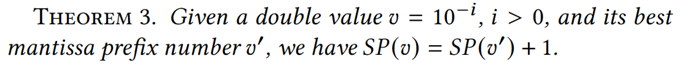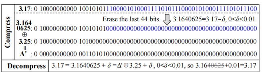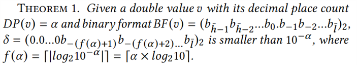,我们可以找到它的一个尾数前缀𝑣’和一个很小的双精度值𝛿,0≤𝛿<10α,使得𝑣’=𝑣−𝛿。如果保留𝑣’和𝛿的信息,可以不损失任何精度地恢复𝑣。
