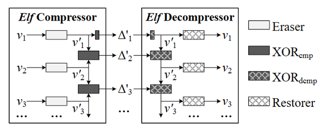 图3显示了𝐸𝑙𝑓算法的总体框架,由擦除器、压缩器、解压器和恢复器组成。在压缩过程中,尽可能多地擦除数据vi的尾随零,由此可以得到一个擦除值v’i,并使用少量比特对XOR结果Δ