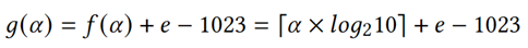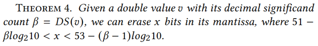 意味着十进制数10-α正好需要𝑓(𝛼)位之后的二进制数来近似表示。根据论文的定理1,𝑣−𝛿可以认为是在𝑣的二进制格式𝐵𝐹(𝑣)中擦除b-f(α)后面的位。又由IEEE754格式可知,一个双精度浮点数的二进制格式中小数点后的每一位,均能与IEEE754格式中的尾数部分
