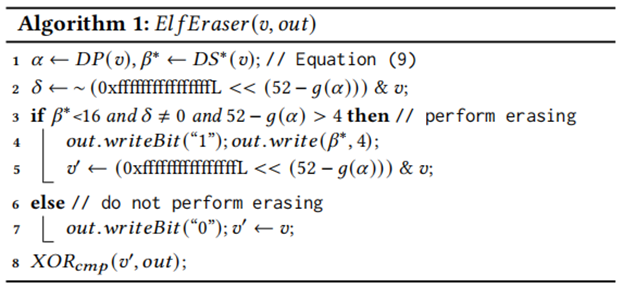 (2)擦除算法:算法1给出了尾数擦除过程的伪代码。算法使用1bit作为标志来指示是否擦除了𝑣,将双精度值𝑣和输出流𝑜𝑢𝑡作为输入。首先,计算小数位数𝛼和修正后的有效值位数𝛽*,并通过提取𝑣的最后52 − 𝑔(𝛼)位尾数位得到𝛿。