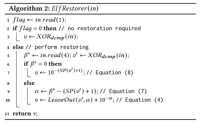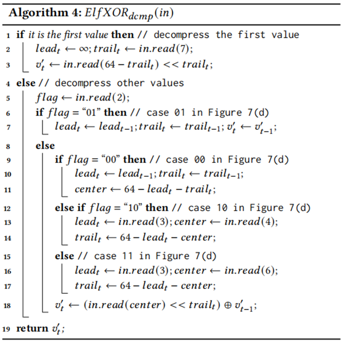 解压缩的过程和与压缩相反。如算法4所示,解压器𝐸𝑙𝑓 XOR𝑑𝑐𝑚𝑝以输入流𝑖𝑛作为输入,在第1-3行中解压缩第一个值,并在第5-17行中分别处理四种不同情况。