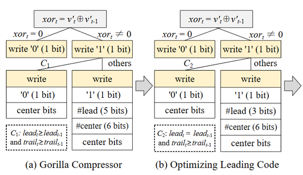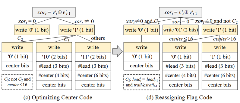 (2)前导零优化:由于XOR值的前导零位数很少大于30或小于8,Chimp仅使用3位来表示最多24个前导零,即用0、8、12、16、18、20、22、24来近似表示前导零位数。如果实际的前导零位数在0到7之间,Chimp将其近似为0,以此类推。因此C1条件转化为C2:leadt= leadt-1 与 trailt ≥ trailt-1。将此优化应用于Gorilla压缩器,如图5(b)所示。