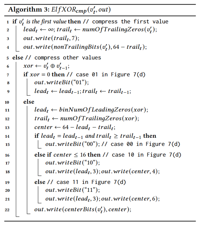 由于被擦除的值v’往往包含长尾零,为了压缩时间序列,论文提出了一种新的基于XOR的压缩器和相应的解压器。
