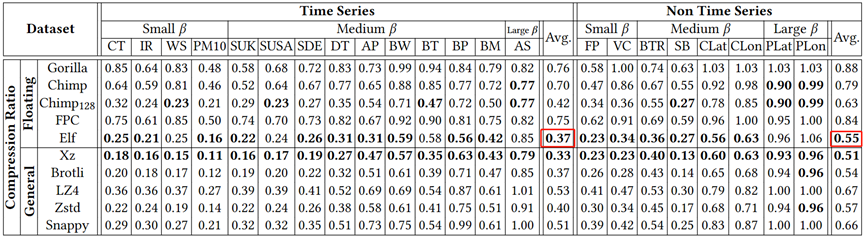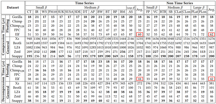 从图6实验结果观察可知,相比无损浮点压缩算法,𝐸𝑙𝑓在几乎所有的数据集上都有最好的压缩率,无论是时间序列数据集,还是非时间序列数据集,其中对于时间序列数据集,𝐸𝑙𝑓的压缩率相对于Gorilla和FPC平均相对提高了51%,并分别比Chimp和Chimp128获得47%和12%的相对改善;𝐸𝑙𝑓与通用压缩算法在压缩率上旗鼓相当,甚至相比LZ4和snappy有明显优势;而对于large 𝛽的数据集,所有压缩算法的压缩率均不理想。