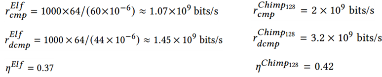 ,当传输速率rtr小于6.17 × 107bits/s时,𝐸𝑙𝑓的总体性能优于Chimp128。在典型的CS架构中,一个连接的带宽很少超过6.17 ×107bits/s,且对于每个连接,Chimp128将分配33KB的内存,这对于高并发场景是负担不起的。