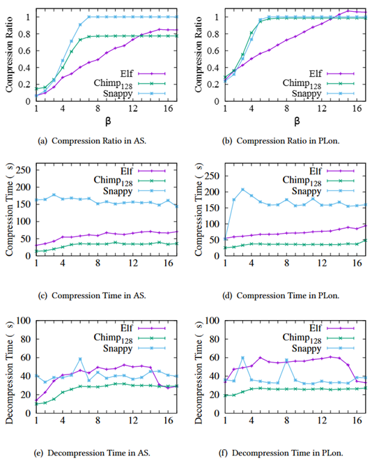 如图8所示,𝛽在3和13之间时,𝐸𝑙𝑓总是保持最好的压缩率。当𝛽= 6时,𝐸𝑙𝑓相对于Chimp128和Snappy的压缩率增益最高。对于不同的𝛽,𝐸𝑙𝑓的压缩时间比Chimp128稍长,但比Snappy短得多。虽然𝐸𝑙𝑓的解压时间大约是Chimp128的两倍,但始终小于60𝜇s。