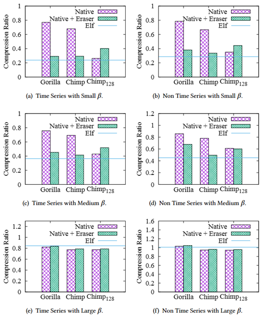如图9所示,对于𝛽较小或中等的数据集,擦除策略都可以显著提高Gorilla和Chimp的压缩率,但Chimp128几乎不能从擦除策略中受益。对于𝛽较大的数据集,𝐸𝑙𝑓擦除器不能增强基于XOR的压缩器的压缩率。