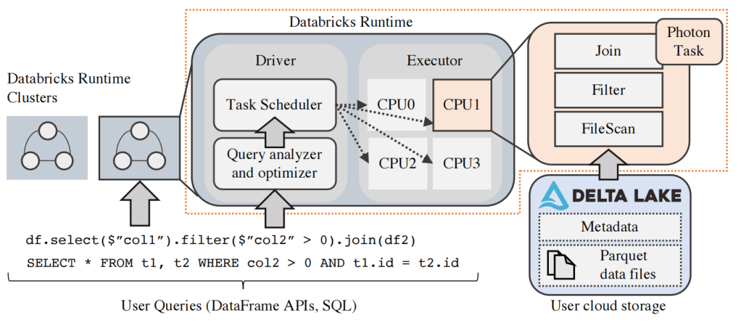 如今的企业为了持续发掘和探索数据价值,会将绝大多数数据存储在可伸缩的弹性数据湖中(例如Azure数据湖存储)。这些数据湖以开放文件格式(例如Apache Parquet)保存原始的数据集,并通过各种引擎(例如Apache Spark)执行各类工作,如机器学习、SQL查询等。然而,这种方式需要预先对原始数据进行ETL处理并将处理后的数据送入数据仓库中才能获得高性能和高并发性,并且ETL过程还可能使得数据仓库中的数据与原始数据不同步。于是,许多企业开始尝试使用湖仓一体的方式存储数据。湖仓一体式架构直接在数据湖之上实现了ACID事务、SQL支持等数据仓库功能,具有简化数据管理、为用户提供统一的方法查询和管理数据等优点。为了最大化湖仓一体式架构的性能,论文提出了向量化查询引擎Photon。设计Photon主要面临两个关键挑战:其一是Photon需要在原始的、非结构化的数据上有良好的性能表现;其二是Photon需要支持现有的Apache Spark DataFrame API,并在查询语义上与之兼容。对于前者,论文的解决方案是使用向量化解释模型来构建引擎,并使用原生语言(C++)实现引擎;对于后者,论文的解决方案是使Photon与Spark高度集成,并通过严苛的测试保证语义一致。为了展示Photon如何与现有的湖仓一体式系统相融合,论文选择了Databricks Lakehouse平台作为示例。Databricks Lakehouse平台由四个主要组建组成:1. 原始数据湖存储层;2. 自动数据管理层;3. 弹性执行层;4. 用户界面。原始数据湖存储层。为了防止用户数据锁定以及避免成本高昂的跨平台数据迁移,Databricks Lakehouse平台将数据存储与计算解耦合,用户可以直接连接到云存储中现有的大型数据集。自动数据管理层。Databricks Lakehouse平台使用Delta Lake实现自动数据管理。Delta Lake是一个开源的基于云对象存储的ACID表存储层,支持ACID事务、时间旅行、审计日志和表格数据集上的快速源数据操作。弹性执行层。图1是弹性执行层的框架图,这一层实现了所有数据处理运行的“数据平面”。执行层主要负责执行“内部”查询(如自动数据聚类和元数据访问)和用户查询(如ETL作业、机器学习和SQL查询)。Photon通过在处理过的数据的每个分区上处理单线程查询来实现与执行层的融合。