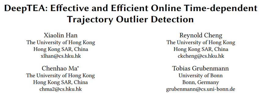 异常轨迹检测旨在提取道路上车辆的异常运动。由于不同时间和地点的交通状况不同,使得异常轨迹检测具有挑战性。其次,基于距离度量计算正常路线并识别异常值的解决方案具有很高的时间复杂度,这阻碍了它们在线异常值检测中的使用。本次为大家带来国际数据库领域的顶级会议VLDB的论文:《DeepTEA: Effective and Efficient Online Time-dependent Trajectory Outlier Detection》