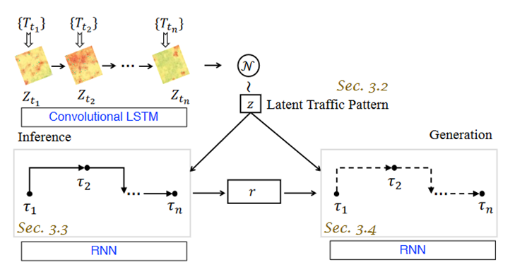 图 1显示了 DeepTEA 的框架。它包含一个推理网络和一个生成网络。给定轨迹 T,论文推断出旅行期间的潜在交通模式q(z|T)。轨迹观察 τ 反映了时间相关的轨迹转换,用于对推理网络中的潜在时间相关路径r建模。之后,时间相关路线r用于生成轨迹观测值 τ。