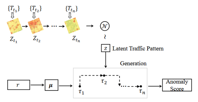 给定学习到的qγ (r|T)和潜在交通模式 z,实时给出的轨迹 T 的异常分数sa (τ1:i):