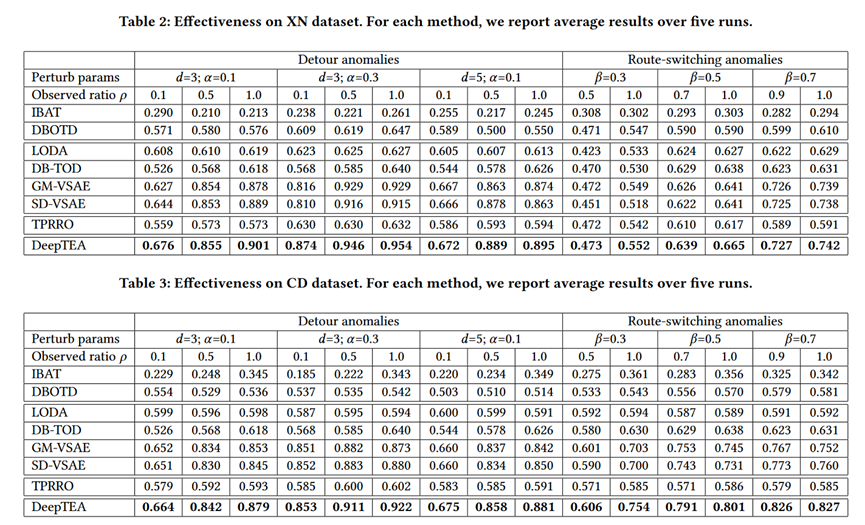论文在变化观测比率(ρ),检测绕行异常,路线切换异常三个方面开展实验,实验结果表明论文提出得基于DeepTEA模型在三个方面得异常检测效果均优于其他方法。